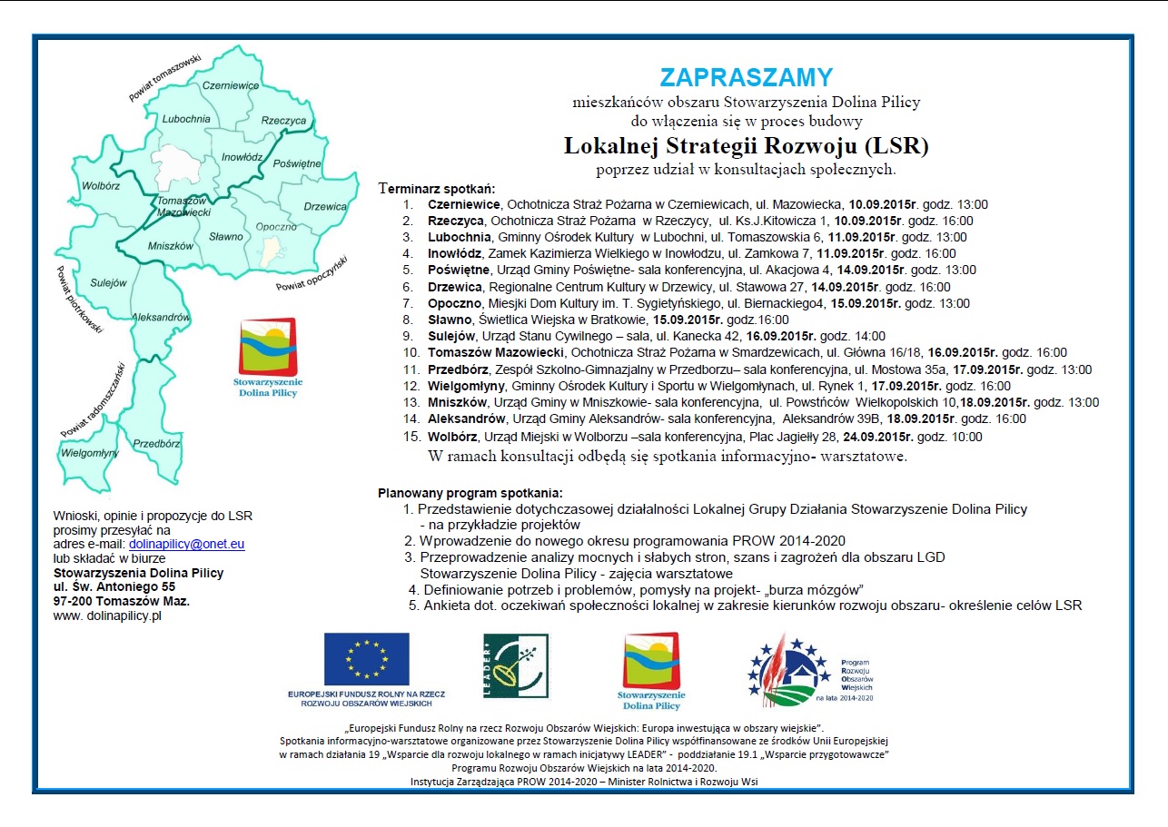 W dniach 10.09-24.09.2015 mieszkańcy obszaru Stowarzyszenia Dolina Pilicy aktywnie włączyli się w proces budowy Lokalnej Strategii Rozwoju (LSR) poprzez udział w konsultacjach społecznych.
