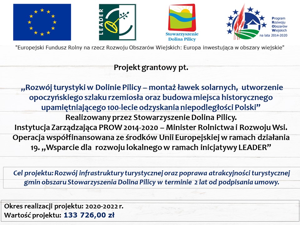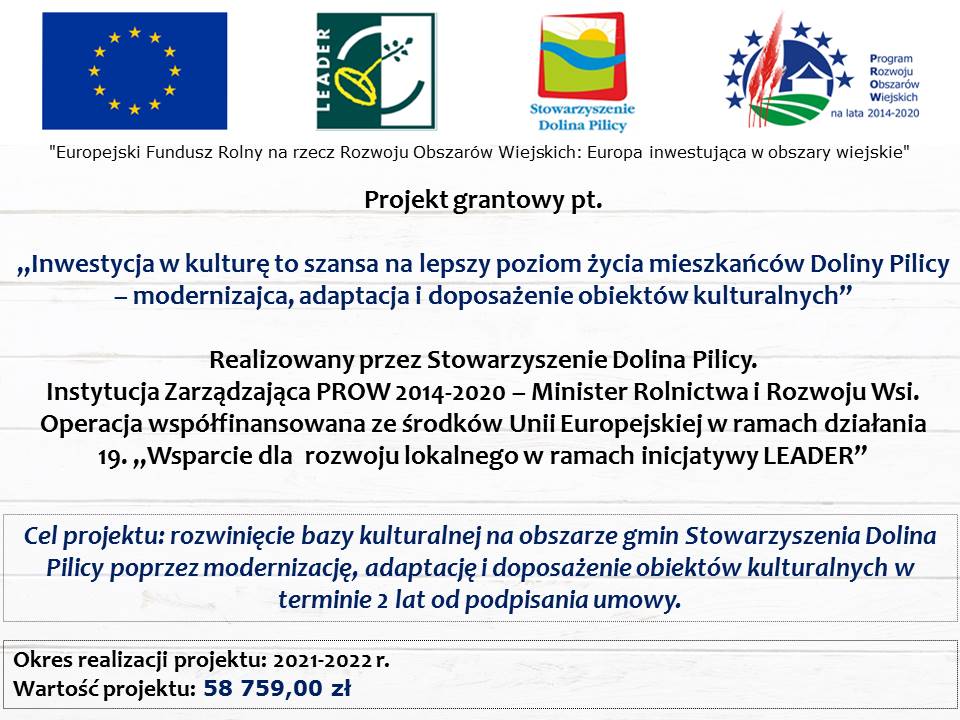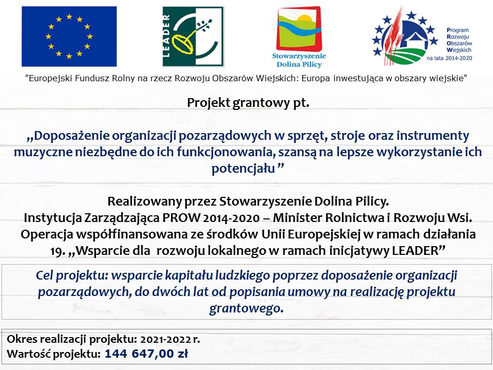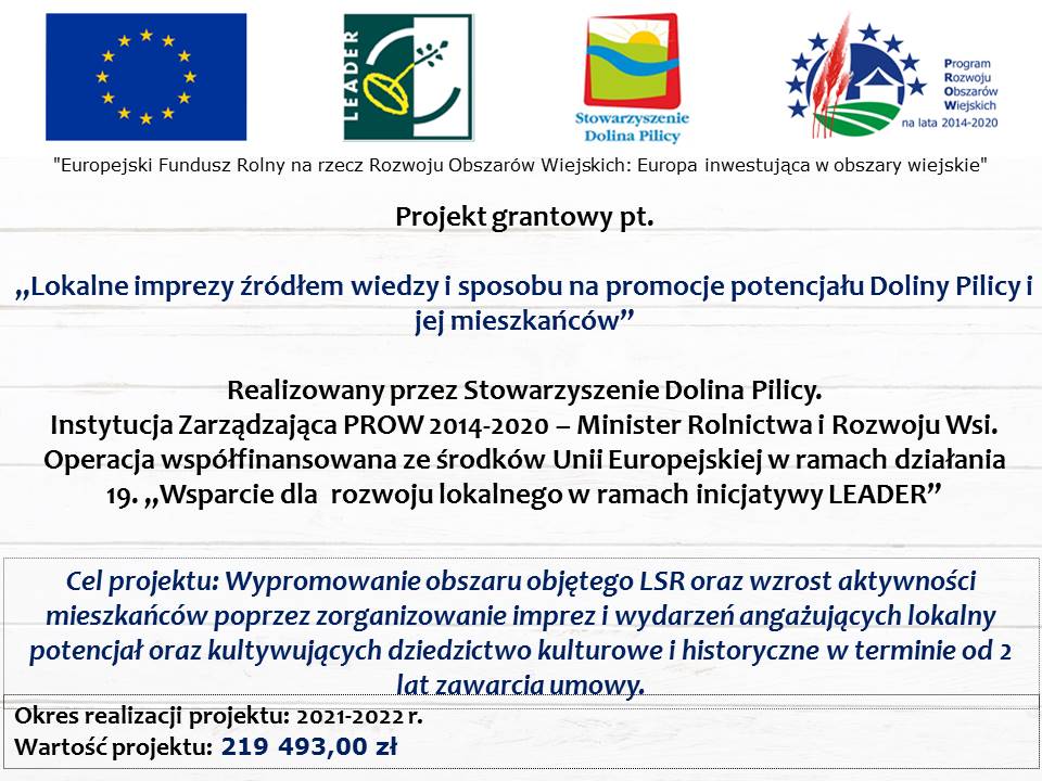 "Europejski Fundusz Rolny na rzecz Rozwoju Obszarów Wiejskich: Europa inwestująca w obszary wiejskie" Strona internetowa opracowana przez Stowarzyszenie Dolina Pilicy współfinansowane ze środków Unii Europejskiej w ramach działania 19 "Wsparcie dla rozwoju lokalnego w ramach inicjatywy LEADER" - poddziałanie 19.4 "Wsparcie na rzecz kosztów bieżących i aktywizacji" Programu Rozwoju Obszarów Wiejskich na lata 2014-2020. Instytucja Zarządzająca PROW 2014-2020 "Minister Rolnictwa i Rozwoju Wsi Cel opearacji: sprawne wdrażanie LSR, w tym realizacja Planu komunikacji. Przewidywane wyniki operacji: osiągnięcie celów i wskaźników wynikających z LSR