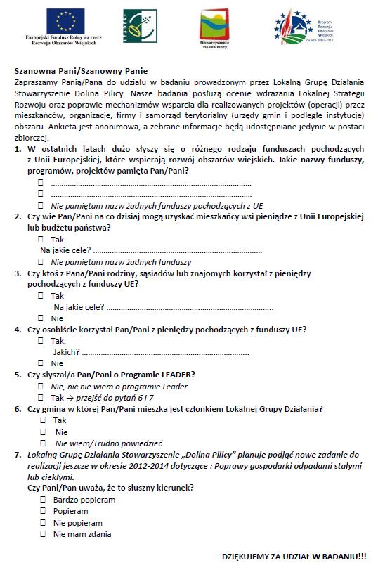 Jest to ankieta badająca działalność naszego LGD i Lokalnej Strategii Rozwoju. Badanie to jest wymagane przez Urząd Marszałkowski i jest elementem prawidłowego rozliczania otrzymanych przez nasze LGD dotacji .