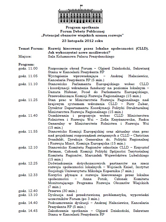 23 listopada w Pałacu Prezydenckim odbyła się konferencja w ramach Forum Debaty Publicznej zatytułowana „Rozwój kierowany przez lokalne społeczności (CLLD).