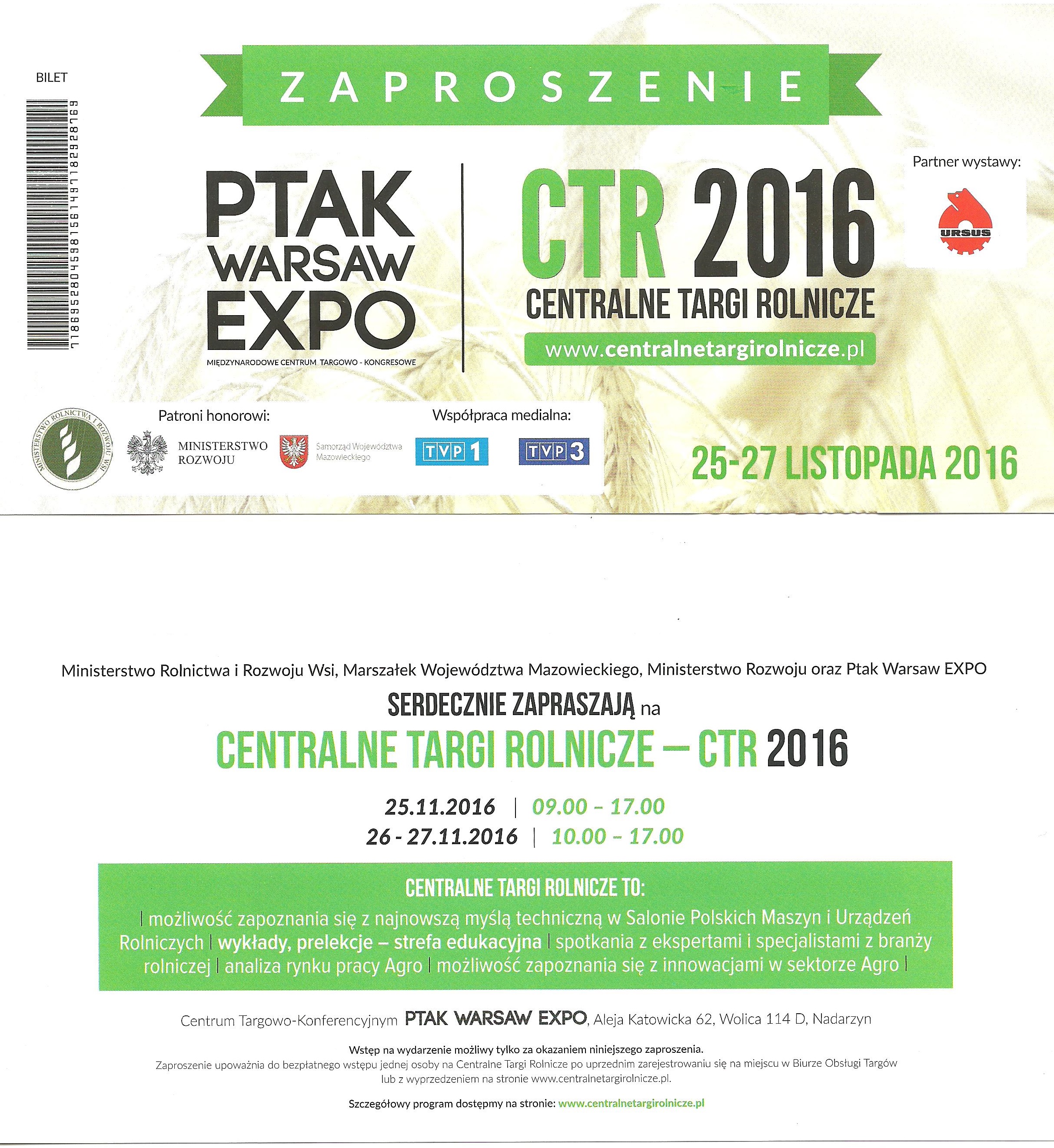 Centralne Targi Rolnicze - CTR 2016 to inicjatywa targowa, dedykowana branży rolno-spożywczej, stanowiąca platformę spotkań rolników i mieszkańców obszarów wiejskich z producentami maszyn, urządzeń, sprzętu do produkcji, hodowli, przetwórstwa i przechowalnictwa, środków do produkcji rolnej, instytucjami oferującymi wsparcie oraz usługi logistyczne, finansowe, doradcze.