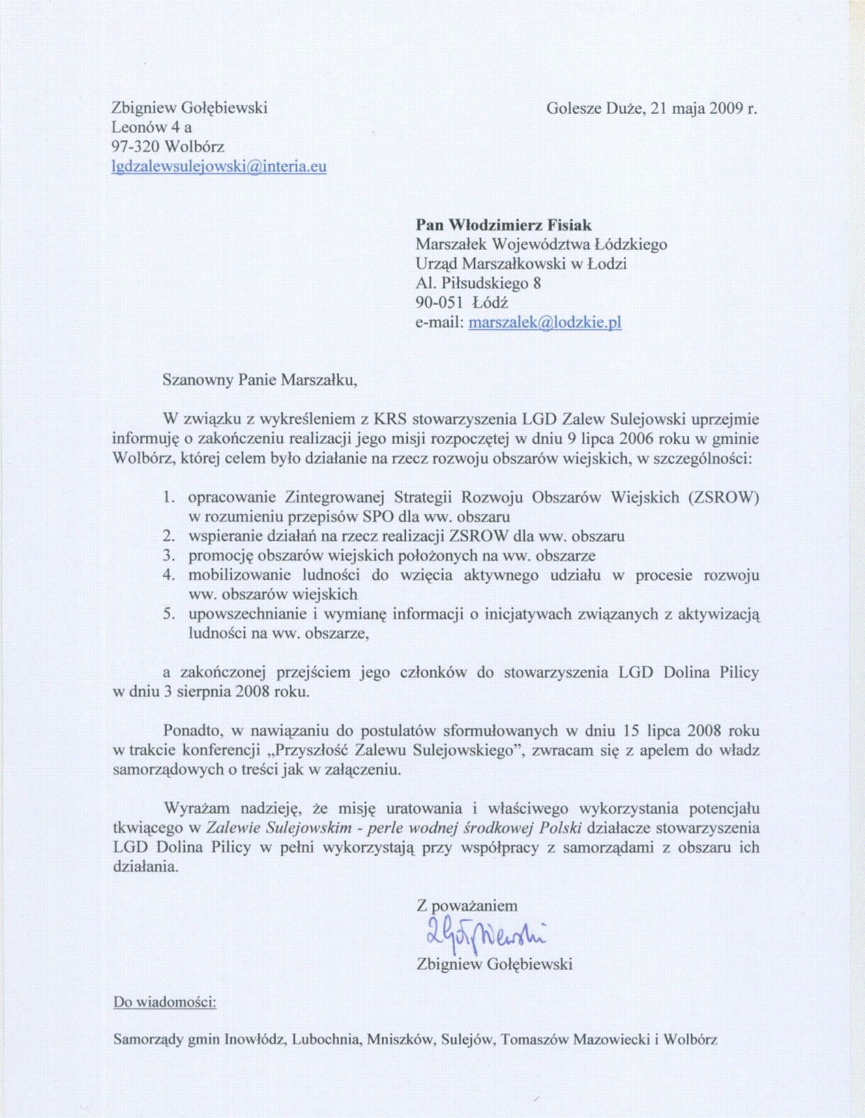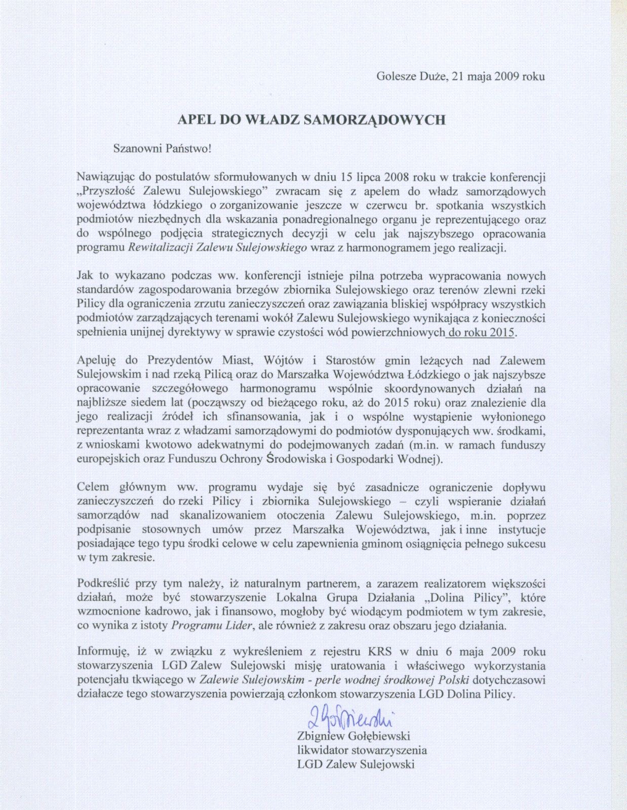 W nawiązaniu do wcześniejszych informacji (26.02.2009, 27.03.2009r.) dotyczących procesu likwidacji Stowarzyszenia Lokalna Grupa Działania - Zalew Sulejowski, na prośbę Pana Zbigniewa Gołębiewskiego ninejszym przekazujemy: